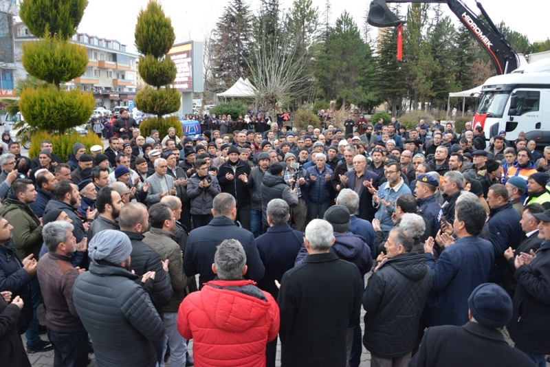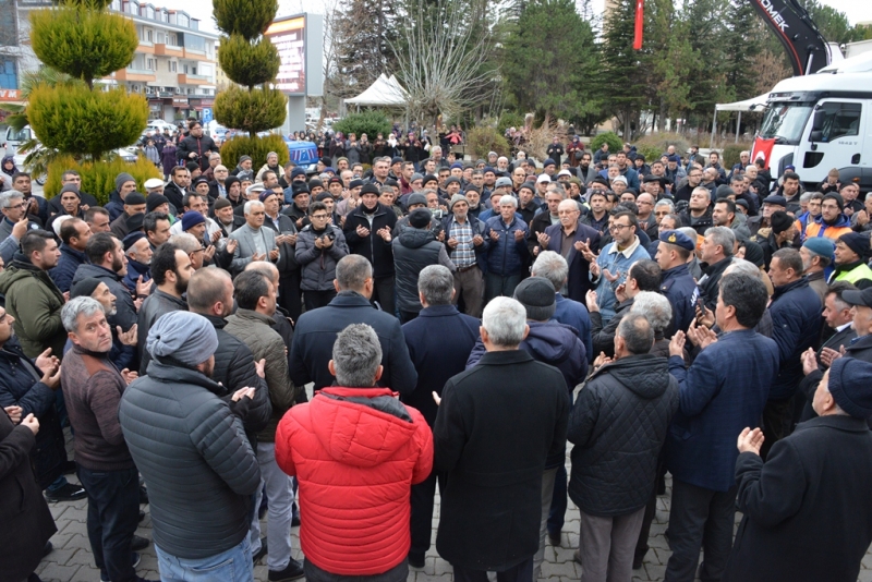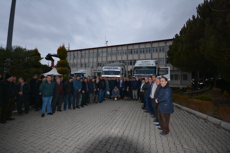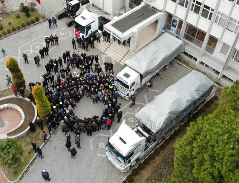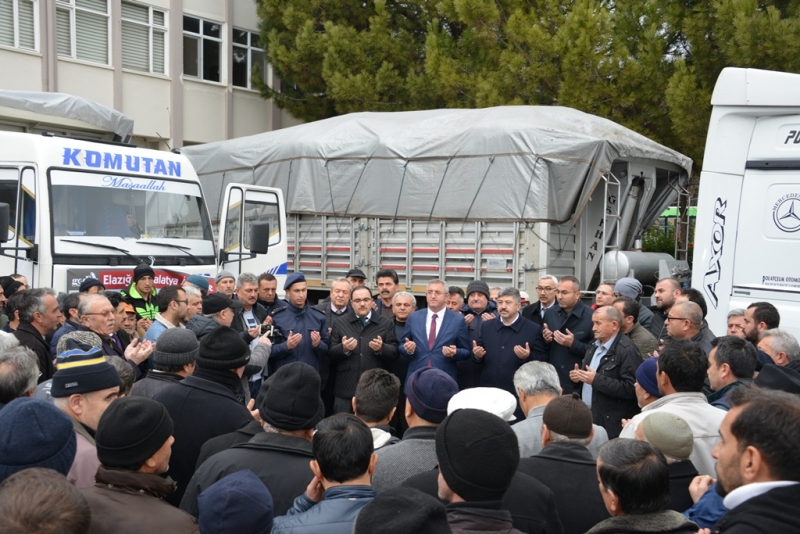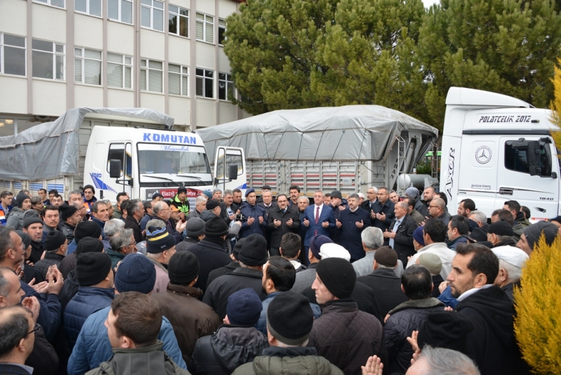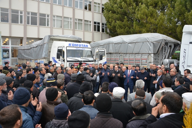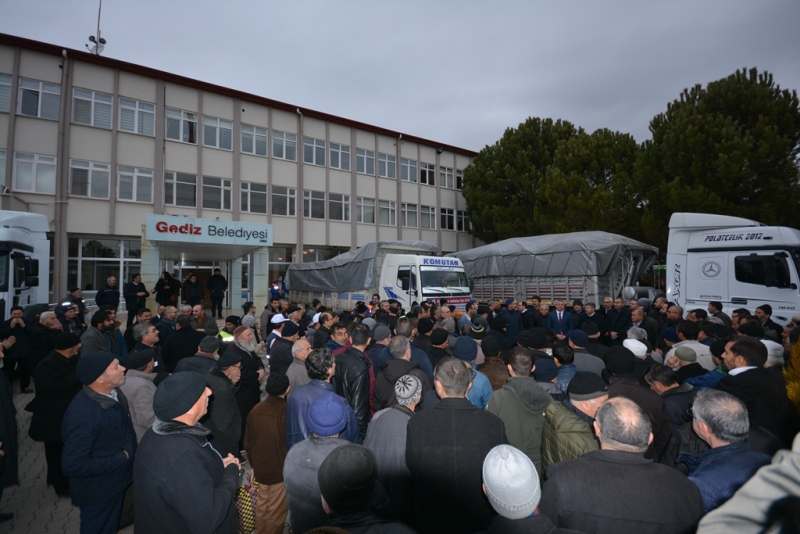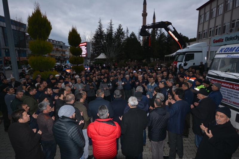 Gediz Belediyesi Hizmet Binası önünde İlçe Müftüsü Nurullah Koçhan tarafından dua edilerek, yardım dolu tırlar yola çıktı.
