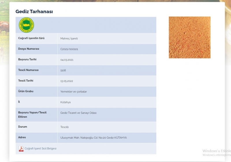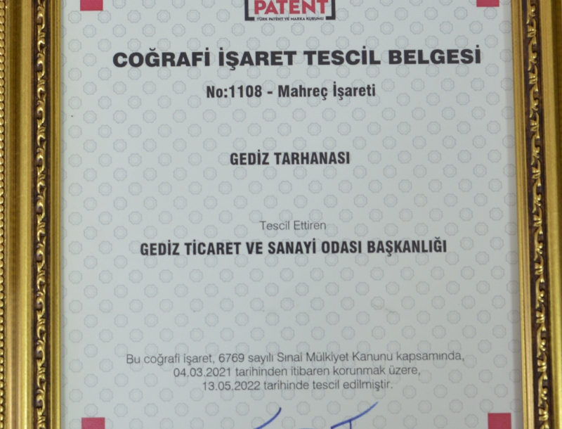 Uzun yıllardan beri Kütahya’nın Gediz ilçesinin unutulmaz damak tadı olarak bilinen, sofraların olmazsa olmazı, eşsiz özelliğe sahip meşhur “Gediz Tarhanasının” Türk Patent ve Marka Kurumu (TÜRKPATENT) tarafından tescillenerek coğrafi işaret tescil belgesinin alındığı bildirildi.